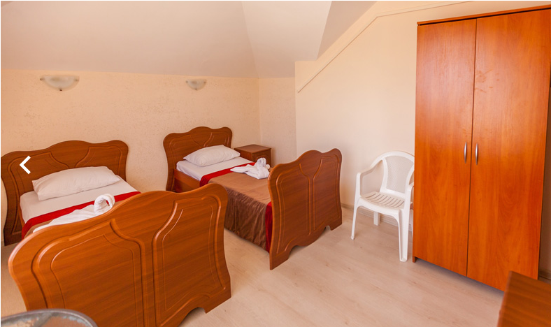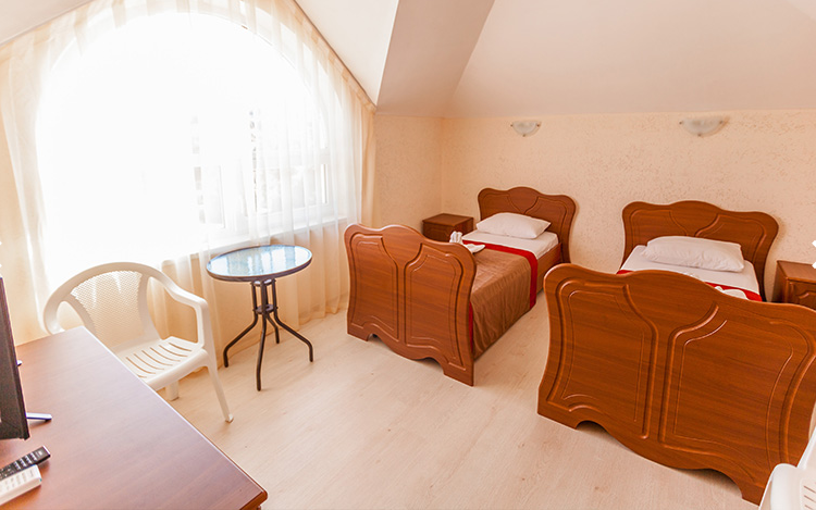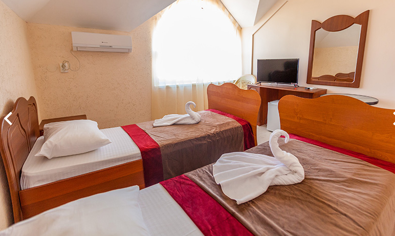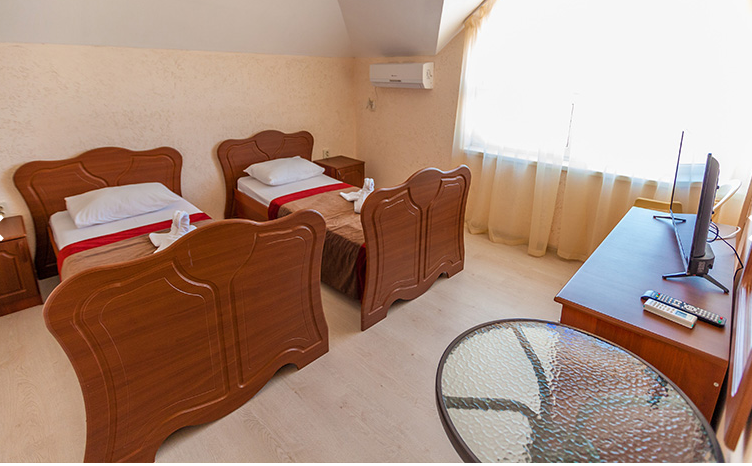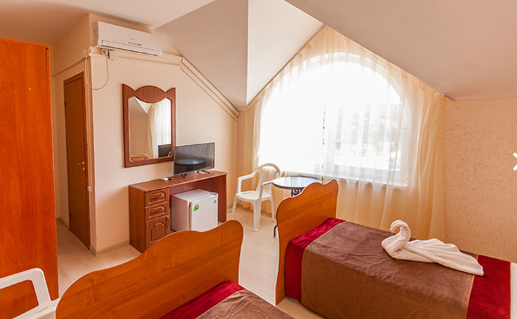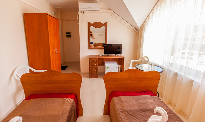 Площадь номера - 20 кв.м. 4 осн. места. Мебель: вешалка, зеркало, кровати односпальные (2), кровать двуспальная, прикроватные тумбочки, стол, стул, шкаф. Оборудование: кондиционер, телевизор, холодильник. Санузел: с душем, туалетные принадлежности. Сервис: Wi-Fi бесплатно, смена полотенец, смена постельного белья, уборка номера.
