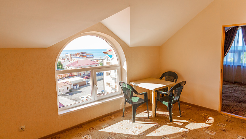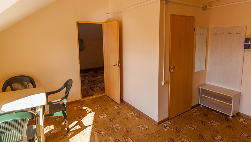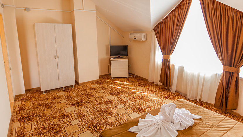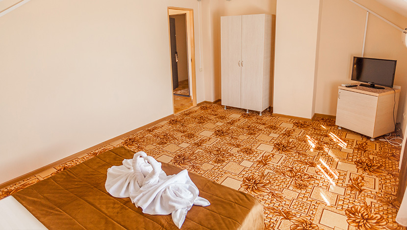 Площадь номера - 40 кв.м. 4 осн. места. 3 доп. места. Мебель: вешалка, зеркало, кровати односпальные (2), кровать двуспальная, прикроватные тумбочки, стол, стулья, тумба под телевизор, шкаф. Оборудование: кондиционер, телевизор, холодильник. Санузел: с душем, туалетные принадлежности. Сервис: Wi-Fi бесплатно, смена полотенец, смена постельного белья, уборка номера.