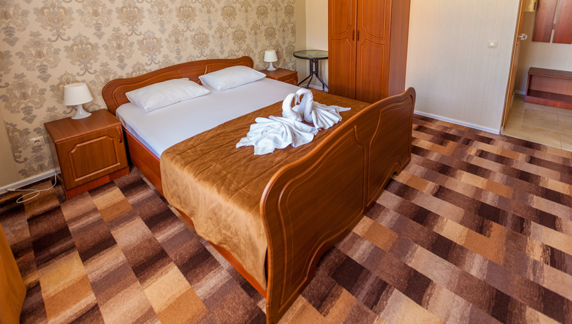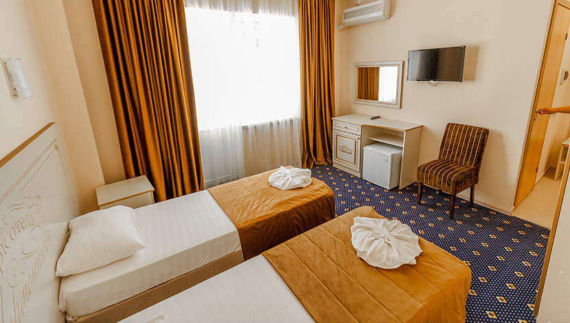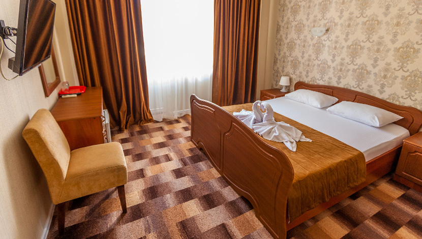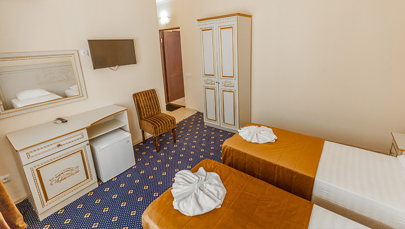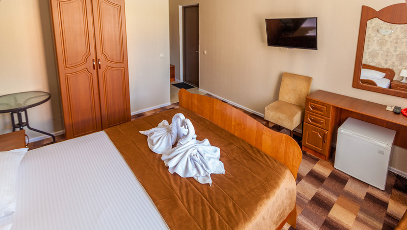 Площадь номера - 20 кв.м. 2 осн. места. 1 доп. место. Балкон. Мебель: вешалка, зеркало, кровать двуспальная/ две полутороспальные кровати, обувная полка, прикроватные тумбочки, стол, тумба, шкаф. Оборудование: кондиционер, телевизор, холодильник. Санузел: с душем, туалетные принадлежности. Сервис: Wi-Fi бесплатно, смена полотенец, смена постельного белья, уборка номера.