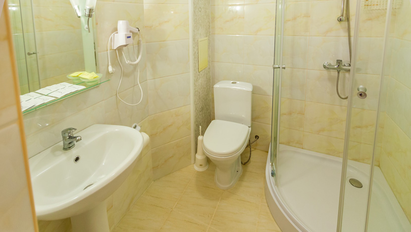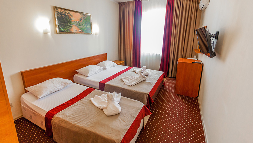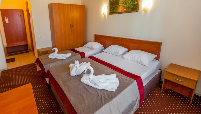 Площадь номера - 20 кв.м. 3 осн. места. Балкон. Мебель: вешалка, зеркало, кровать двуспальная, кровать односпальная, прикроватные тумбочки, стол, стул, шкаф. Оборудование: кондиционер, телевизор, холодильник. Санузел: с душем, туалетные принадлежности. Сервис: Wi-Fi бесплатно, смена полотенец, смена постельного белья, уборка номера.